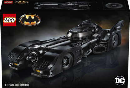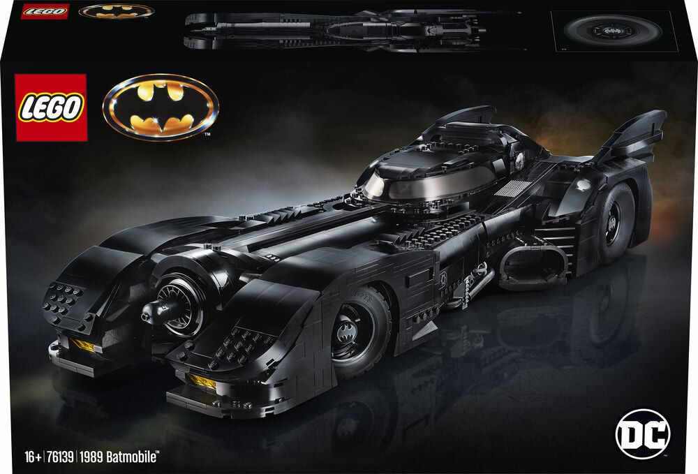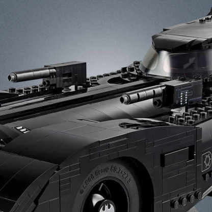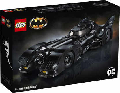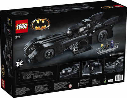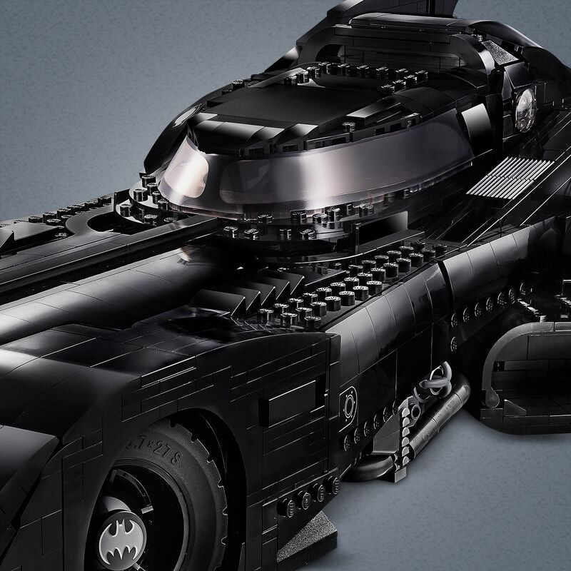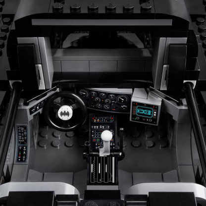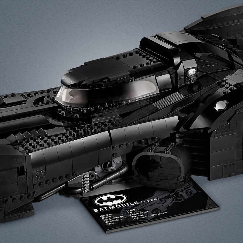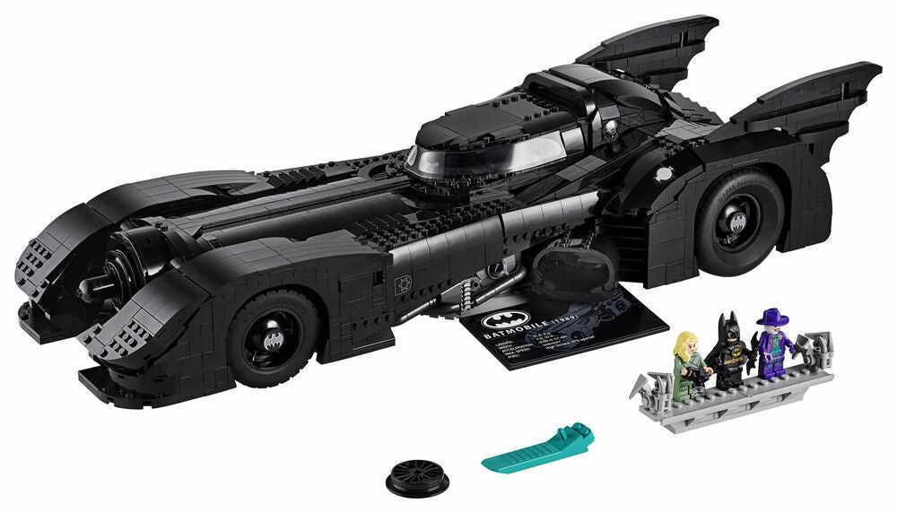 • This LEGO brick version of the 1989 Batmobile features a slide-open cockpit with a new-for-November-2019 wraparound windshield element, 2 minifigure seats, a steering wheel, stick shift and dashboard stickers, 2 hidden, non-shooting machine guns under the bonnet with a pop-up function activated by rotating the turbine exhaust, 2 decorative grappling hooks, wheel trims with the Bat logo and specially designed tyres for the front wheels, batwings and other iconic design details.