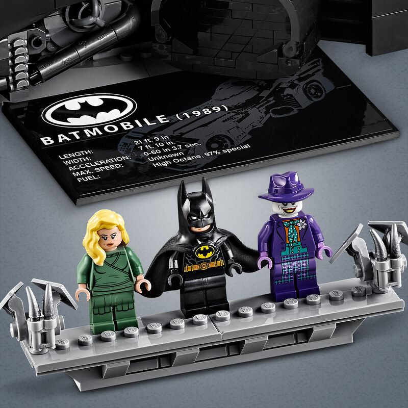 • This LEGO set also includes a brick-built rotating display stand for the Batman™ toy car with an attached information plate with 1989 Batmobile statistics.